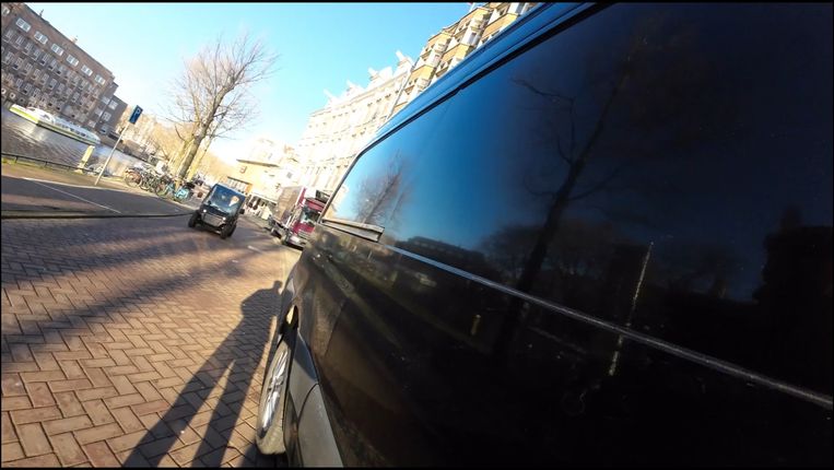 Een paar seconden later in het filmpje rijdt er een Biro langs op de Leidsekade. In de reflectie van de ruit is vrij duidelijk de filmende man zichtbaar. Wederom met de houthakkersjas aan. Hij drinkt een langwerpig blikje dat veel lijkt op een Red Bull-blikje. Een drankje dat hij vaker drinkt in zijn video’s. Ook zijn hoge voorhoofd en inhammen zijn te zien in de weerspiegeling.